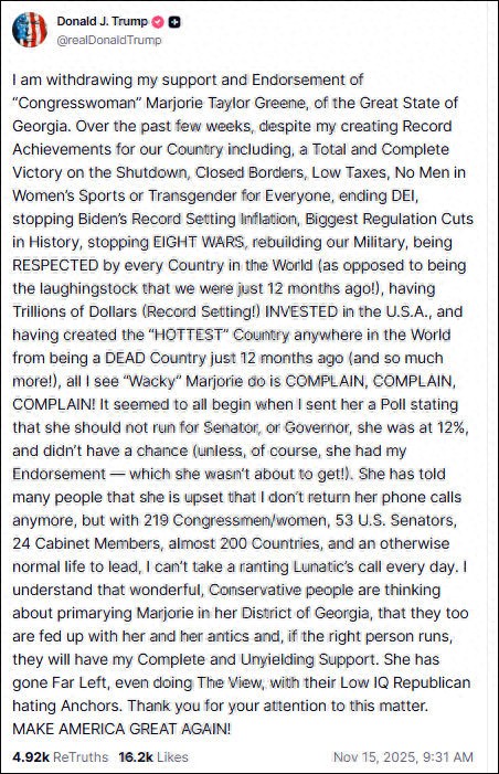 "我正撤回对众议员玛乔丽·泰勒·格林的支持和背书。"他补充说,格林正在竞选2026年连任,但她已经"走向极左"。