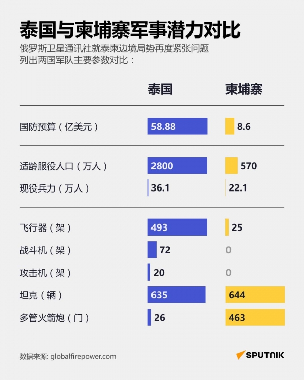 泰国军方的自信并非毫无理由--数据显示,泰国的国防经费高达58.88亿美元,而柬埔寨仅为8.6亿美元;泰国拥有493架各型军机,而柬埔寨只有25架,可以说制空权几乎被泰国一手控制;而柬埔寨虽然拥有远多于泰国的多管火箭炮(463门),但柬埔寨现役兵力只有22万,远比泰国36万的兵力要少。