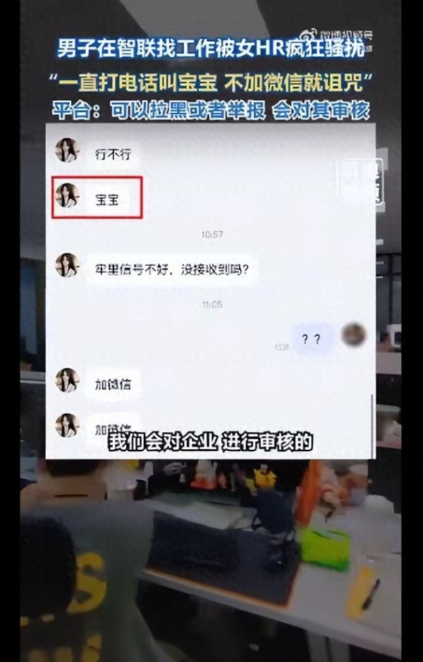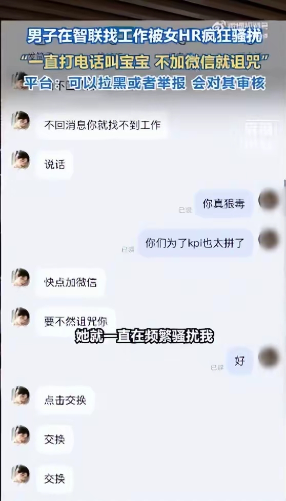 近日,陕西西安一位男士在智联招聘找工作时,遭遇了让人气愤的事:只因觉得工作不合适没回复,女HR就频繁发消息纠缠,不仅一口一个"宝宝",被拒绝加微信后还发消息诅咒"牢里收不到信息吗"。不少人觉得这只是"职场奇葩事",但从法律角度看,这可不是"恶心一下"那么简单,受害者完全能拿起法律武器维权。