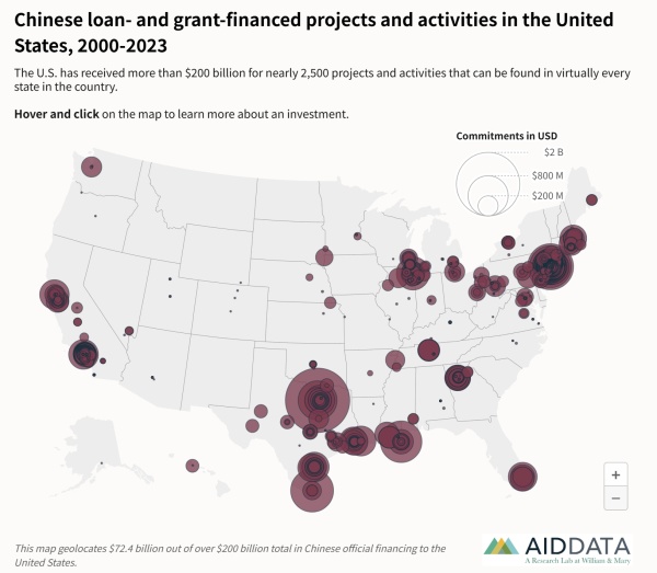 据《纽约时报》、《华盛顿邮报》等18日报道,当地时间周二,AidData发布报告称,根据对中国对外融资的最新研究,他们得出了一个"出人意料且违背直觉"(unexpected and counterintuitive)的结论:尽管美国政府不断对发展中国家嘀嘀咕咕所谓"中国债务陷阱"的陈词滥调,但事实上,在2000至2023年间,中国金融机构向美国放贷超2000亿美元,在全美几乎所有州共支持了2500个项目,规模超过对其他任何国家的贷款。