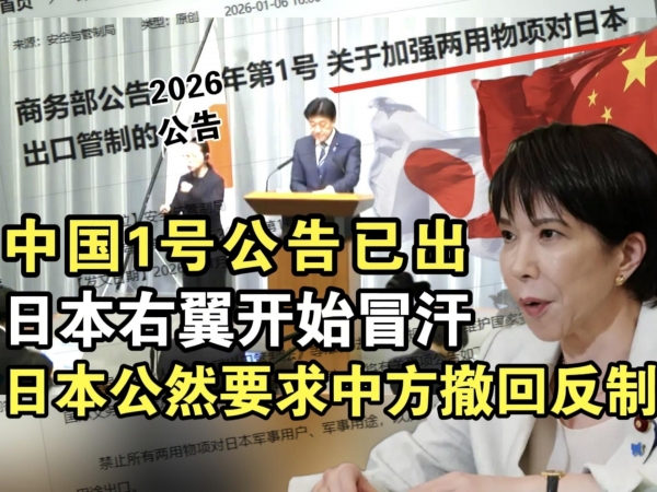 中国商务部2026年1月6日发布的本年度1号公告,一经出台便震动东京,公告明确禁止向日本涉军企业出口两用物项。面对这一正当反制举措,日本右翼政客却慌了神,不仅公然要求中方撤回相关措施,还发表了一系列颠倒黑白、倒打一耙的表态,完全无视自身此前错误言行引发的后果。