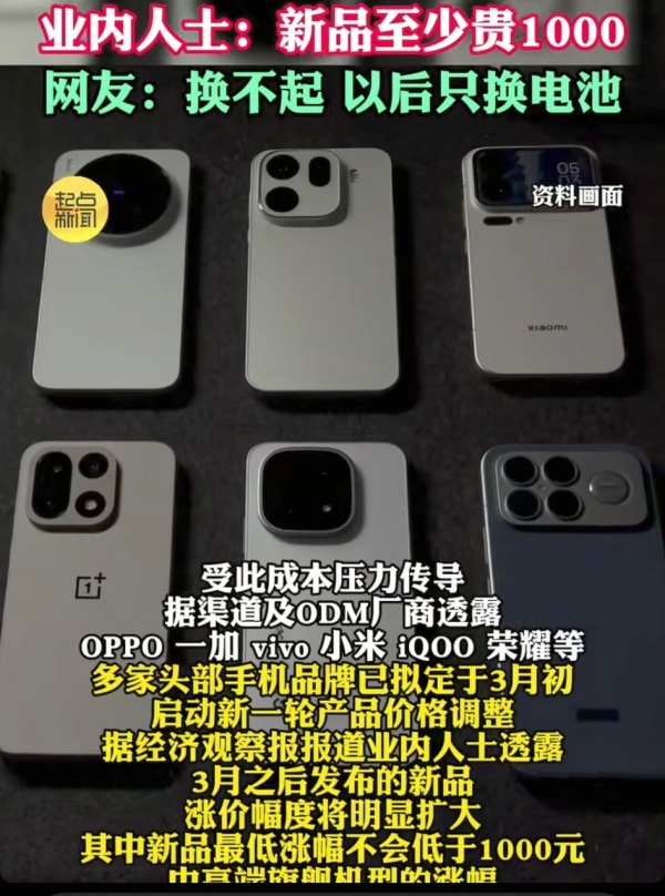 网友晒出同款手机前后价差:同配置一月差500元,评论炸锅:早买省出一顿火锅钱!最近"手机全面涨价"冲上热搜,安卓阵营几乎全到场,3月后新品普遍涨300-1000元,旗舰更贵2000+。