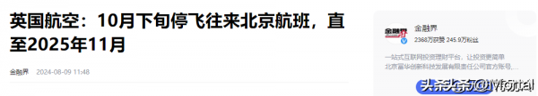 这波"停飞潮"来势汹汹,首当其冲的便是英国航空,这家老牌航空巨头,近期接连宣布停飞多条中国航线,其中包括备受关注的伦敦希思罗至北京大兴航线,停飞时间更是长达一年之久,引发了广泛关注和讨论,无独有偶,与英国航空同属一家的维珍航空也紧随其后,宣布将从今年10月起停飞上海航线