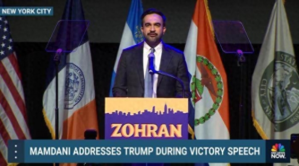 4日晚,马姆达尼在胜选演讲中表示,他将和美国总统特朗普"对抗"。