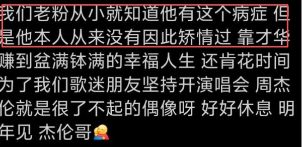 评论区的网友也是纷纷发文表示,身为老粉的他们早就知道他的身体状态了,但这位歌手并没有因此矫情,为了照顾粉丝的心情,依旧坚持开演唱会。