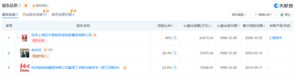 杭州娃哈哈集团有限公司由宗庆后担任法定代表人并持股29.4%,该公司大股东为杭州上城区文商旅投资控股集团有限公司,持股46%,杭州娃哈哈集团有限公司基层工会联合委员会(职工持股会)对该公司持股24.6%。(图/天眼查)