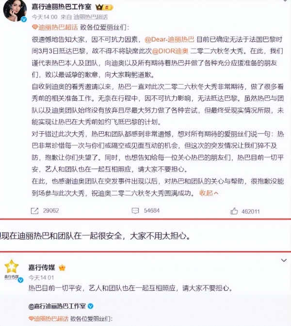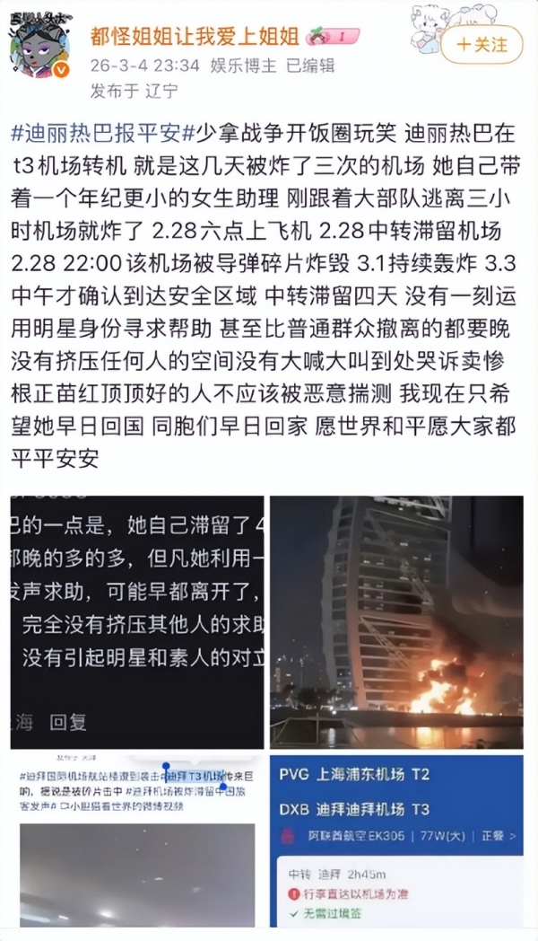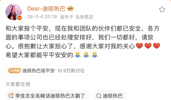 在热巴带着小助理辗转到安全的地方后,她终于发了动态安抚粉丝,让一直支持自己的人安心。