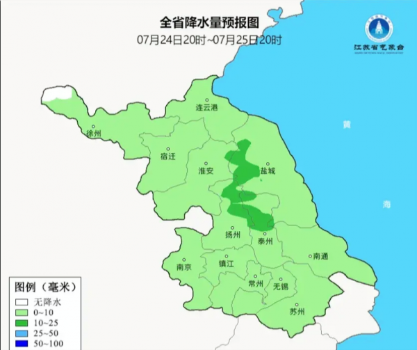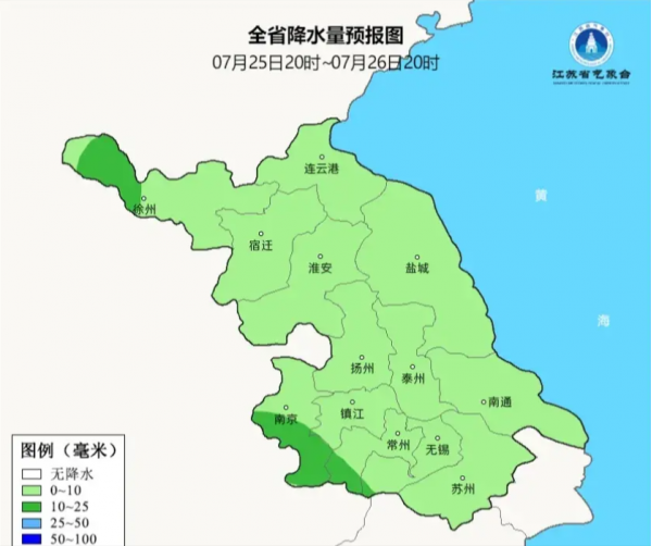 7月25日-26日白天,整个江苏将迎来风雨交加的天气。全省阴有阵雨或雷雨,西部地区局部地区雨量可达中等。受降雨影响,除西北部地区维持在33-34℃外,部分地区最高气温将降至31-32℃。风力进一步加大,沿江和苏南地区偏东风6-7级,阵风可达8级。