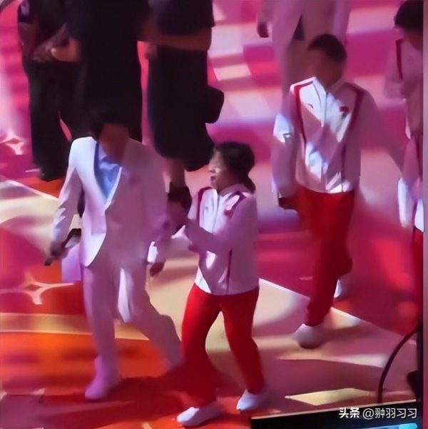 在大家和香港明星愉快合影的时候,全红婵却跟着和自己身高差不多的王祖蓝手挽手一蹦一跳的去"玩儿"了。