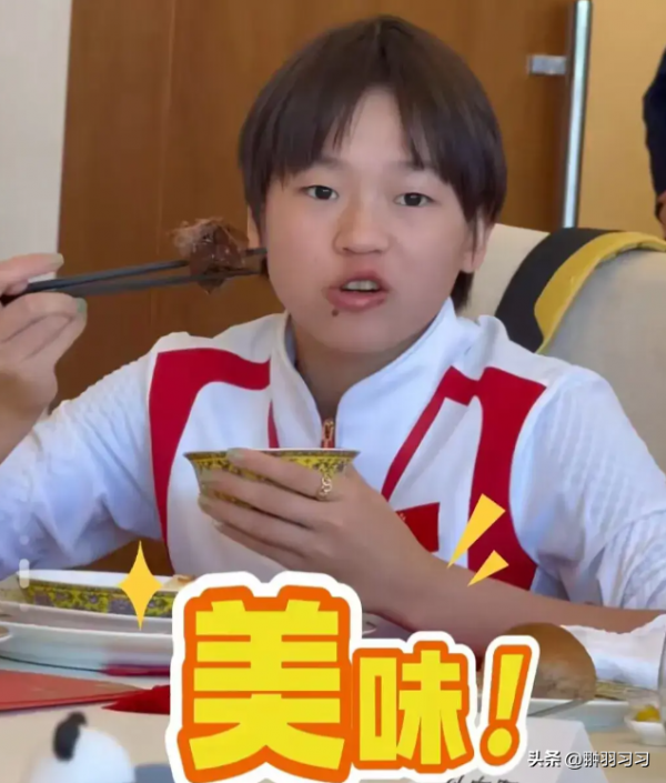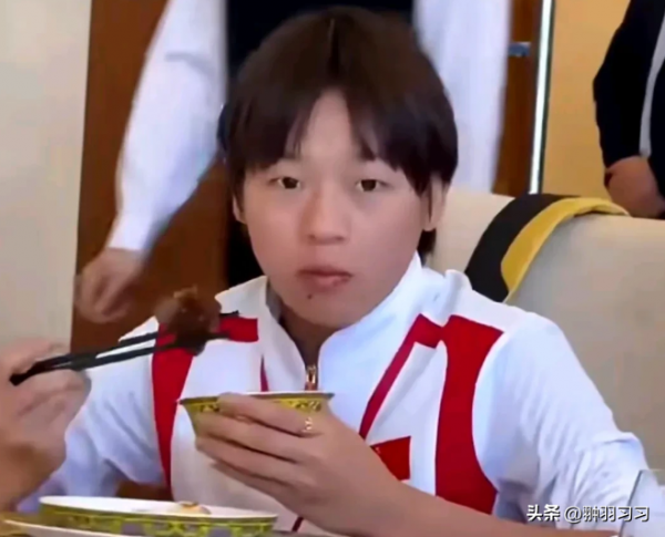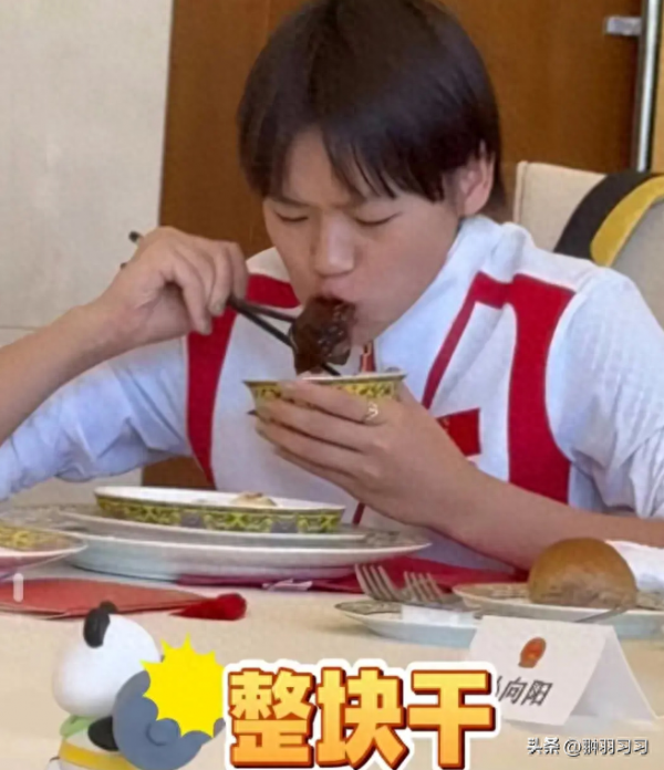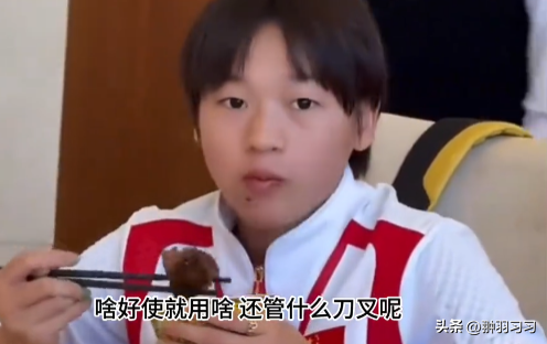 而且,在吃饭时全红婵的画风就跟别的运动员不一样了,全红婵并没有使用刀叉这样的西餐礼仪,而是选择了一种相当随性的方式享受美食。