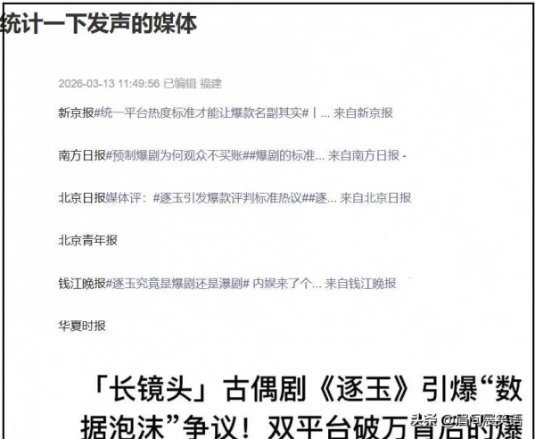 张凌赫、田曦薇主演的《逐玉》遭遇一场疯狂风波。短短几日,已有超过十家媒体公开讨论剧集热度造假的问题。从官媒到地方报纸、电视台再到外媒,阵容几乎覆盖全国,连新加坡联合日报也参与发声。这种罕见的连环追问,让《逐玉》的"出圈"带着明显的丑闻色彩。