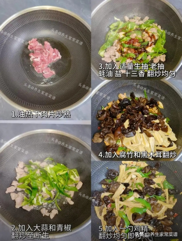 食材处理小技巧:黑木耳用温水泡发15分钟,泡好后用手轻轻揉搓,洗掉根部的泥沙;腐竹用冷水泡软,别用热水,不然容易外软内硬;泡发木耳的水过滤后可以用来炒菜,更鲜味儿。