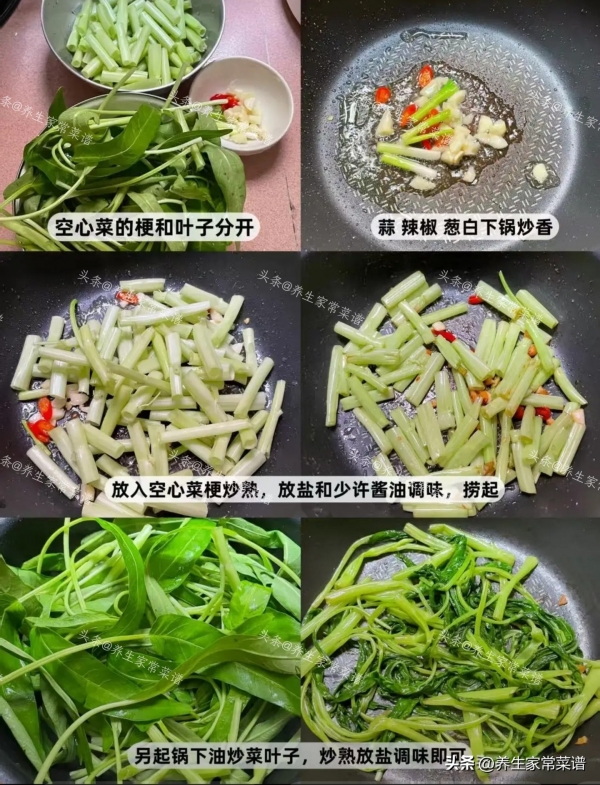 食材处理小技巧:空心菜摘去老梗,只留嫩梢和叶片,用淡盐水泡5分钟,去掉表面的灰尘和小虫;炒之前沥干水分,大火快炒,避免炒烂出水,口感更脆嫩。