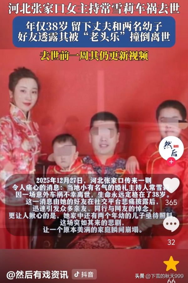 12月27日,一则让上痛心的消息传来,河北张家口小有名气的婚礼主持人常雪莉遭遇车祸不幸离世,她年轻的生命永远的定格在了38岁,只留下丈夫和2个年幼孩子,让人无比的悲痛和伤心,而她的意外离世的经历更是让人意难平!