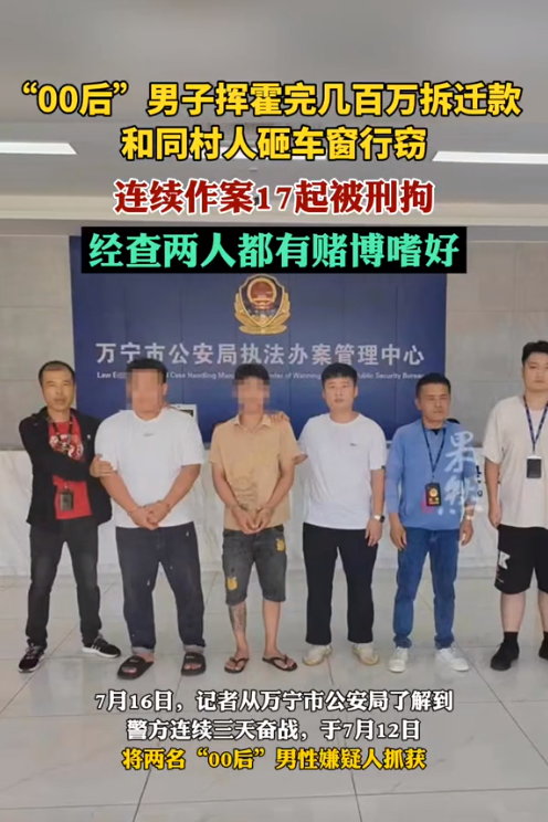据果然视频报道:"00后"男子挥霍完几百万拆迁款,和同村人砸车窗行窃连续作案17起被刑拘,经查两人都有赌博嗜好。