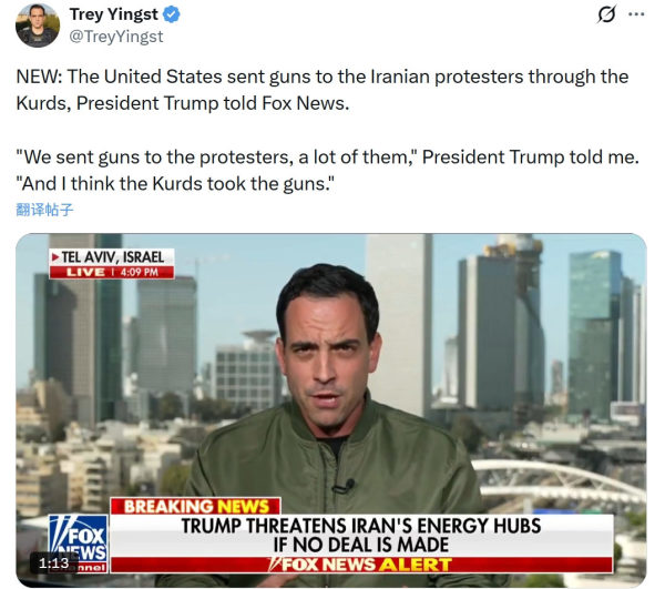 不过,共和党"御用"媒体福克斯新闻的首席外事记者特里·英斯特(Trey Yingst)近日爆料称,特朗普在电话采访中首次承认,美国在此次抗议期间曾试图秘密武装伊朗抗议者,然而运送的大量枪支并未送达目标人群,他怀疑是被作为中间人的库尔德反政府武装扣下了。