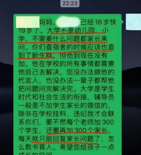 老师也解释说,一个辅导员每隔要管280多个学生,天天回答那么多家长的问题,他根本无时间干正事。除非真的紧急情况,否则他一般不跟家长联系。