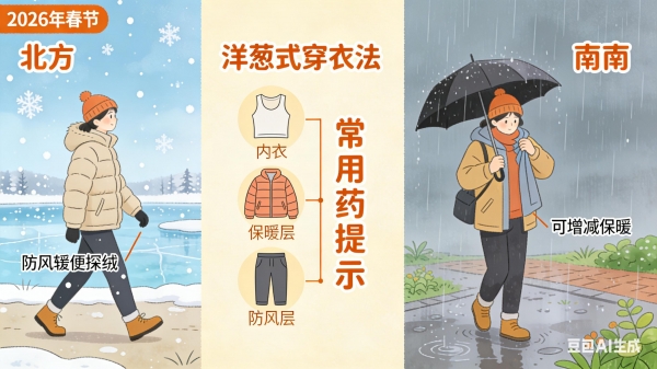 不管是返乡团圆还是出门旅游,这份天气指南请收好:北方备防风轻便羽绒服,注意室内保湿;南方带好雨具和可增减的保暖外套,防范湿冷和短时降温;全国都需备好常用药,应对气温波动引发的感冒。