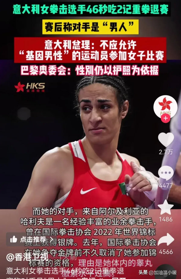 哈利夫也是跨性别拳击手,他只用46秒差点把意大利女选手鼻梁打断,女选手哭着宣布退出比赛,他成功晋级。