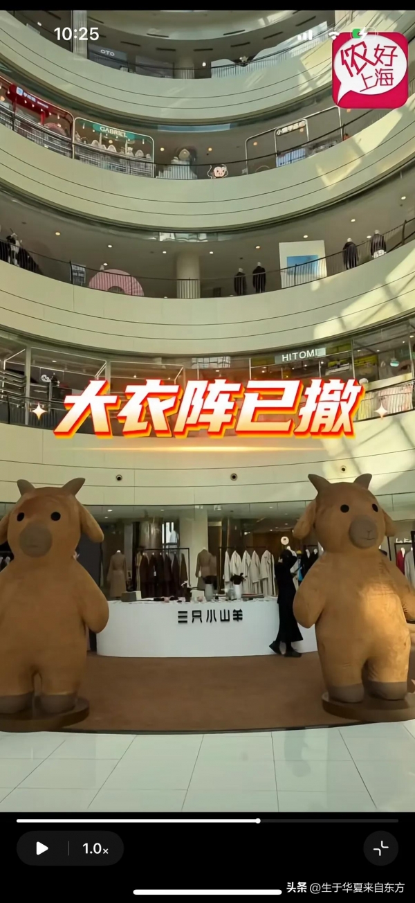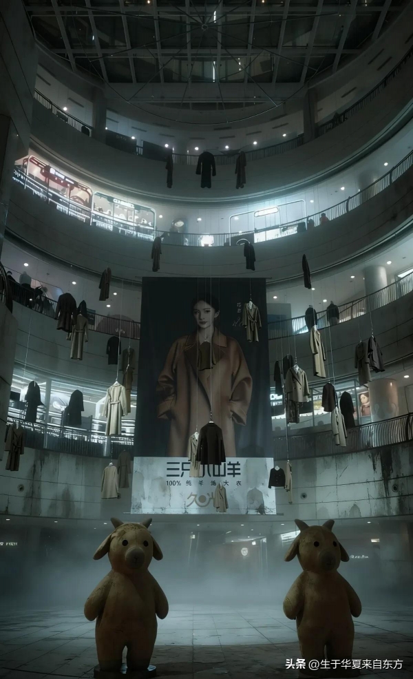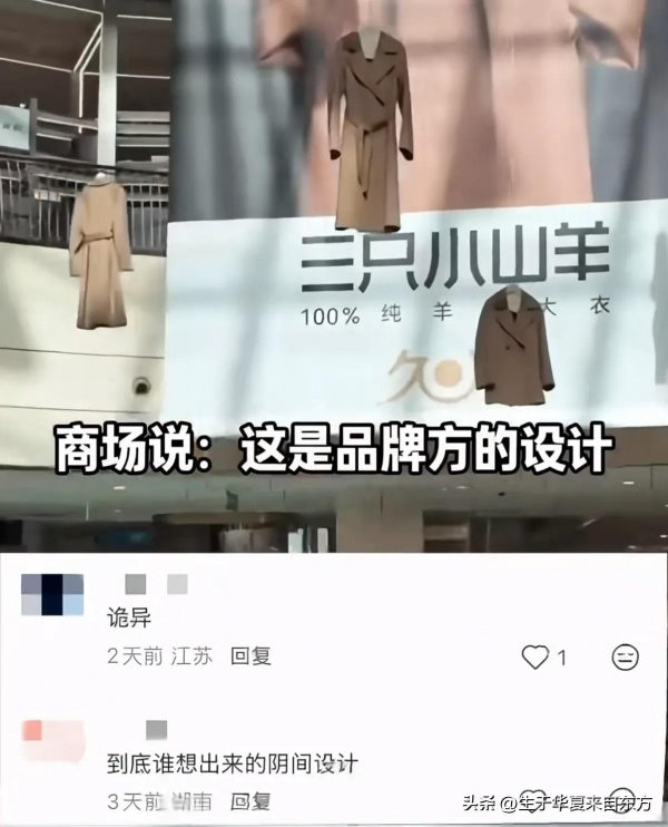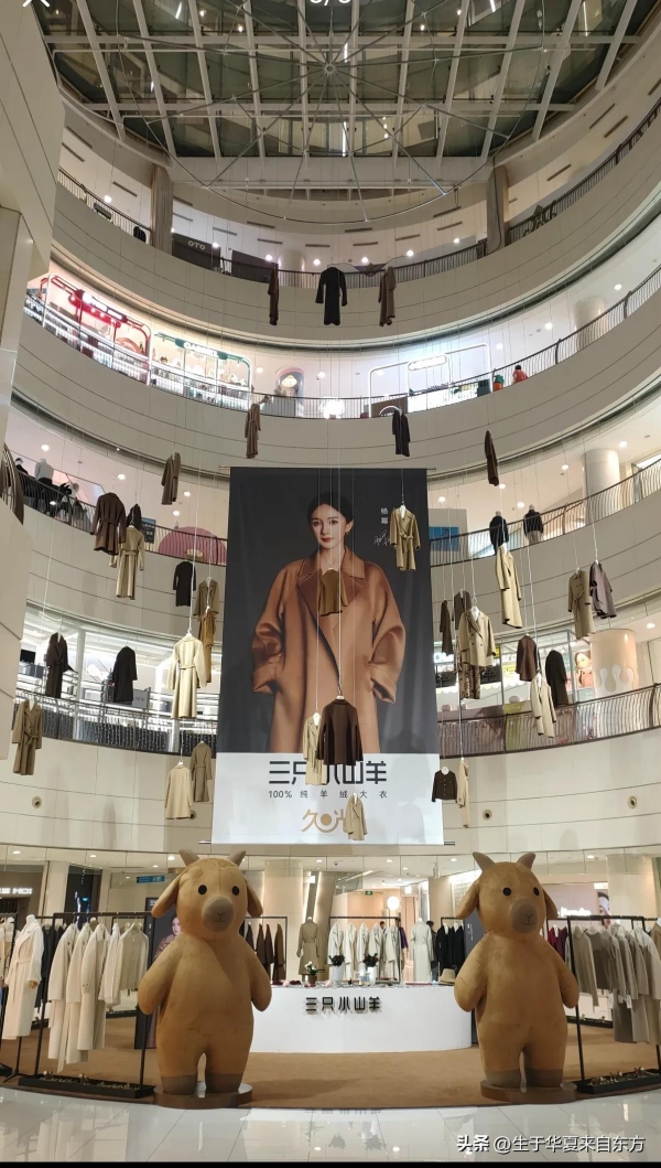 南京西路静安久光百货,上海人心中的高端逛街地标,2025年末却因一组展陈被推上风口。杨幂代言的"三只小山羊"品牌,用透明鱼线吊着数十件大衣悬在中庭,高低错落晃悠,中间立着巨幅代言海报,诡异感扑面而来。
