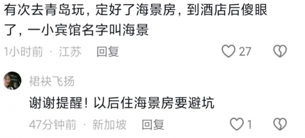 有网友表示,有一次去青岛玩,订好了海景房,到酒店后傻眼了,一个小宾馆名字叫海景。