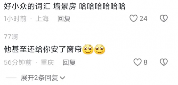 也有网友表示,他甚至还给安了窗帘,好小众的词汇,墙景房。