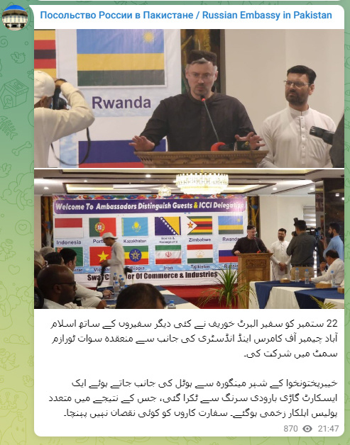 俄罗斯驻巴基斯坦大使馆Telegram账号发布消息