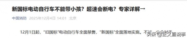 中国消防 2025-12-04《新国标电动自行车不能带小孩?超速会断电?专家详解→》