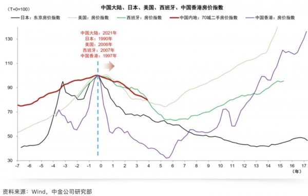 先看这张图,这是我们,日本,美国,西班牙,香港的房价到顶点之后的走势图,可以看到除了日本持续走低30年,其他几个城市房价基本上在五年左右都实现了触底反弹,而且要知道日本当时是伴随着广场协议,外贸股市经济的全面崩盘,而我们当下经济转型,股市新高,黄金新高,外贸顺差历史新高,所以房价并不太会永远跌下去。