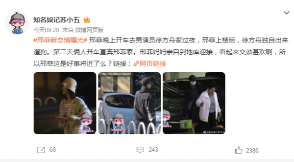 2025年11月4日,多家娱乐媒体(如"知名娱记苏小五")爆料称,邢菲被拍到深夜独自驾车前往徐方舟住所过夜;次日两人同乘返回邢菲住处时,邢菲母亲亲自到地库迎接,三人互动自然熟络,被推测关系稳定且已获家庭认可。