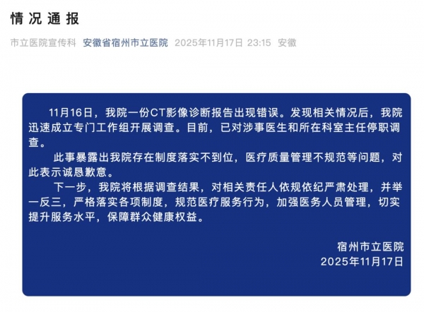 "11月16日,我院一份CT影像诊断报告出现错误。发现相关情况后,我院迅速成立专门工作组开展调查。目前,已对涉事医生和所在科室主任停职调查。