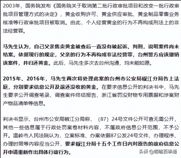 2015年,马先生将椒江分局告上法庭,要求信息公开。他想知道,这个案子的笔录、终结报告,特别是那批黄金的"涉案物品清单"和"罚没票据"在哪里。