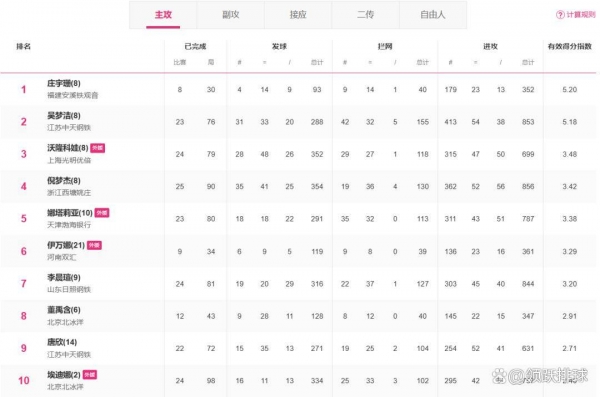 让我们首先聚焦竞争最为白热化的主攻榜。本赛季,福建队的庄宇珊上演了一出精彩的"逆袭"大戏,力压群芳,最终荣登榜首。而此前一直领跑的江苏队吴梦洁,则略显遗憾地退居第二。回顾整个赛季,主攻榜的争夺可谓贯穿始终,扣人心弦。从最终的数据来看,庄宇珊以高达5.20的有效得分指数傲视群雄,其含金量之高毋庸置疑。尤其考虑到她在福建队中承担的绝对核心地位,几乎是以一己之力扛起了整个队伍的进攻重任,这样的表现更显得难能可贵。吴梦洁原本长期占据榜首位置,但在总决赛第三场与上海队的较量中,面对对方极具针对性的发球压制和严密的拦防体系,她的进攻效率受到了一定的影响,最终被庄宇珊抓住机会,成功实现反超。