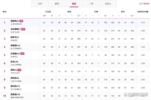 接应位置的情况则略显不同,强力外援依然占据着主导地位,本土球员要想实现突破,仍然面临着不小的挑战。在接应榜的前十名中,外援占据了多达四个席位,前两名更是被范赖克和法布里斯两位外援牢牢把持。不过,令人欣慰的是,河南队的段梦可异军突起,成功闯入第三名,成为本土接应中的翘楚。此外,排名第六的孙杰也凭借其出色的表现,荣获了"最佳接应"的荣誉。目前,我国仍然十分稀缺具备强力进攻能力的接应球员。但值得注意的是,在前十名的名单中,也有一些本土球员展现出了在进攻端稳定输出的能力,具备了与外援一较高下的潜力。这些本土球员的涌现,对于中国女排未来接应位置的人才储备具有非常重要的意义。