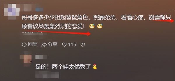 "哥哥多多少少担起爸爸角色,照顾弟弟,看着心疼,谢霆锋只顾着谈场轰轰烈烈的恋爱!"