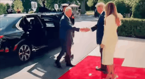 欢迎仪式上,查尔斯踏上美方为其铺设的红毯,并与特朗普握手。特朗普将于今年6月年满80岁,其标志性的强势握手力道极大。英媒报道称,双方握手时,查尔斯"并不示弱",视频显示,双方手上较劲了近十秒。