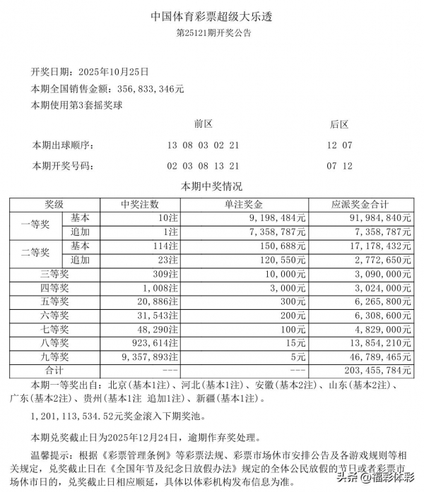 北京时间2025年10月25日大乐透第2025121期开奖!