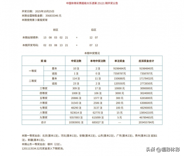本期全国共开出10注一等奖单注奖金919余万元,开出1注追加奖单注奖金735余万元,其中山东德州2注、安徽2注、广东2注、北京1注、河北1注、新疆1注,贵州1注基本1注追加;