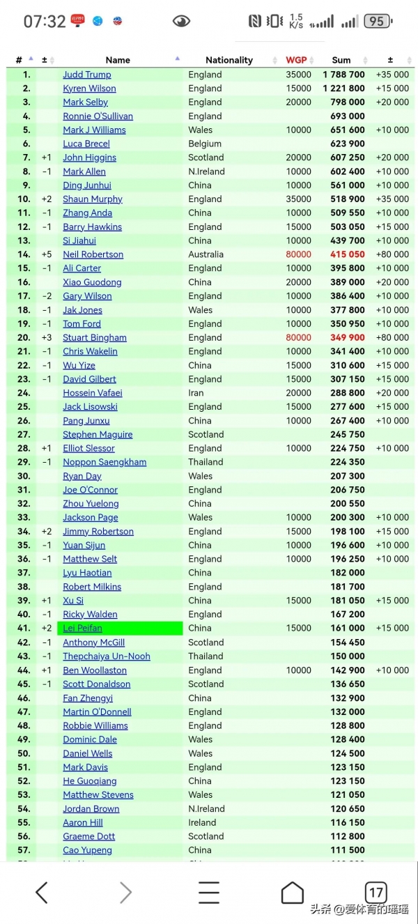 另外,最新的世界大奖赛的排名也相继出炉。肖恩墨菲在本站比赛打进到半决赛之后也获得了3.5万英镑的奖励在这样的情况之下也是让他的世界排名重新回到了前十位。而丁俊晖的世界排名继续在第九。约翰希金斯排在第7继续在成绩方面力压丁俊晖。而丁俊晖在接下来还将参加巡回锦标赛和球员锦标赛两项重要的赛事。而丁俊晖也是在本赛季很难跌出前十。另外特鲁姆普,凯伦威尔逊还有马克塞尔比继续排在世界的前三。奥沙利文马克威廉姆斯还有卢卡布雷希尔分别占据着第四到第六的位置。而马克艾伦在扣除了积分之后,世界排名来到了第八。尼尔罗伯逊在打进世界大奖赛的决赛之后,世界排名飙升到了第14如果他能夺得本站比赛的冠军,那么他的世界排名将超越张安达来到第11当然,如果不能夺冠,那么他就将继续占据第15位置。
