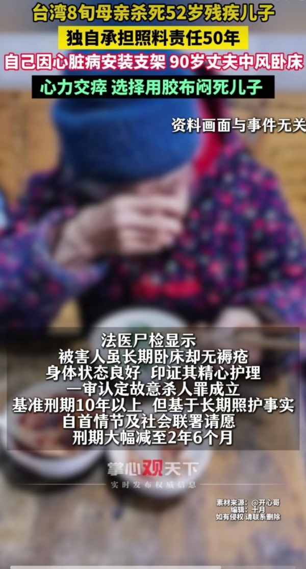 在中国台湾地区,一位将近八旬的老人闷死了自己52岁的儿子,动手之前,她还给儿子口中塞了一个大红包,希望他能在黄泉路上不被欺负。
