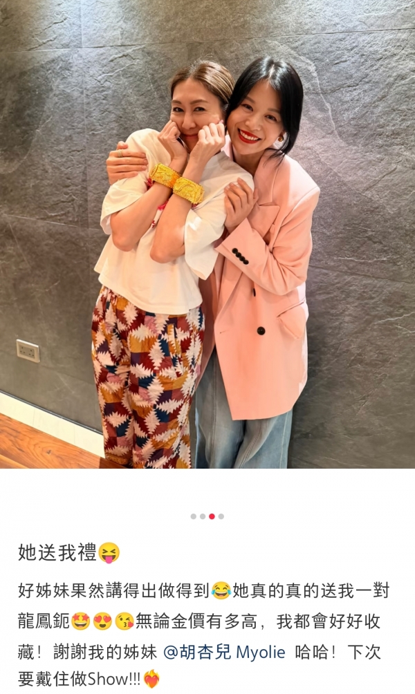 给姐妹庆祝新婚的胡杏儿还准备了份新婚礼物给胡定欣,一对纯金打造的龙凤镯,寓意"龙凤呈祥,婚姻美满"。收到金镯的胡定欣还发文表示不论金价涨到多高,她都会好好收藏这份礼物。
