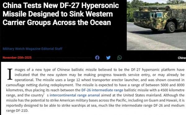 "九.三"阅兵中,国产高超声速导弹群带来的震撼尚未散去,美国"Defence-Blog"、"Military Watch"等网站,近日又不约而同开始报道,性能更进一步但并未登上阅兵场的东风-27。"射程5000至8000千米,可以跨越太平洋,直接打击在美军西海岸活动的航母"的评价,确实很震撼。