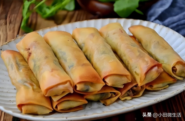 3、春卷:南方常见的形式,是将馅料(如豆芽、肉丝)包入面皮后油炸而成,外酥里嫩。