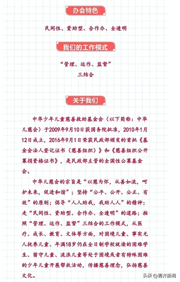 据中华少年儿童慈善救助基金会官网消息,中华儿慈会办会特色是"民间性、资助性、合作办、全透明",2010年1月12日成立。