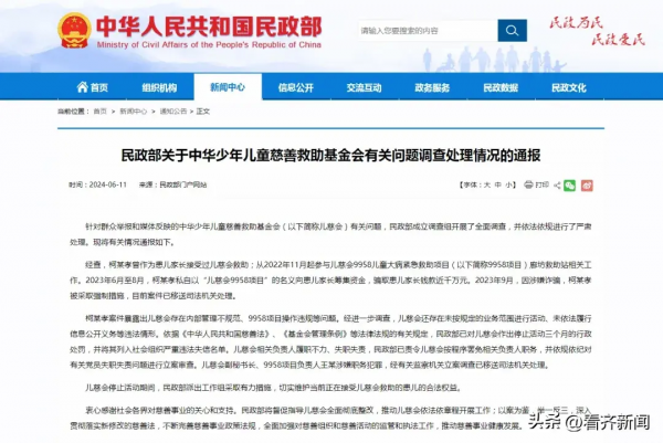 2024年6月11日,民政部通报关于中华少年儿童慈善救助基金会有关问题调查处理情况。通报称柯某孝案件暴露出儿慈会存在内部管理不规范、9958项目操作违规等问题。经进一步调查,儿慈会还存在未按规定的业务范围进行活动、未依法履行信息公开义务等违法情形。依据《中华人民共和国慈善法》、《基金会管理条例》等法律法规的有关规定,民政部已对儿慈会作出停止活动三个月的行政处罚,并将其列入社会组织严重违法失信名单。