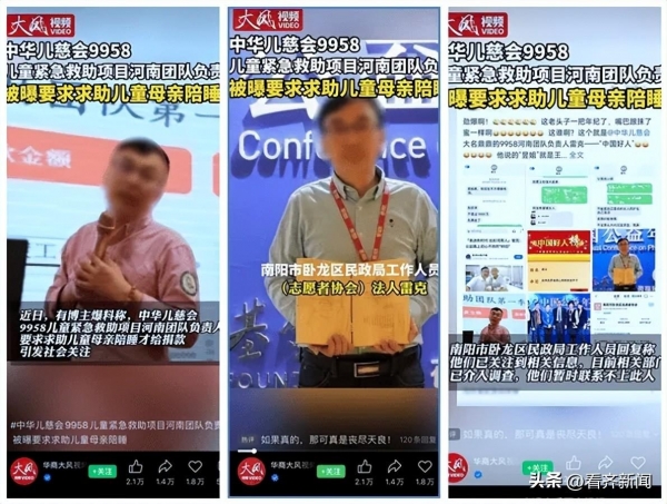 另据媒体华商报大风视频和海报新闻视频号进一步详细报道,近日,河南南阳有大V在网上爆料中华儿慈会河南负责人、9958志愿者雷某哄骗患病孩子妈妈陪睡才给捐款。有网友称:"雷某让患病孩子妈妈陪他睡一次,给一点捐款,再睡一次,再给点捐款,直到把患病孩子拖死,把捐款吞了。"曝光的疑似雷某与患病孩子妈妈的聊天截图中,雷某直言:"爱你,爱你一辈子。"对此,中华儿慈会工作人员回应:"不清楚此事,要向领导反馈。"河南省民政厅慈善处回应:"正在了解情况和核实。"