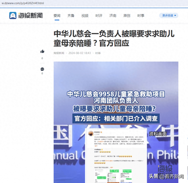 8月2日,据山东媒体海报新闻报道,网传中华儿慈会9958儿童紧急救助项目河南团队负责人被曝要求求助儿童妈妈陪睡,随后官方回应相关部门已介入调查。