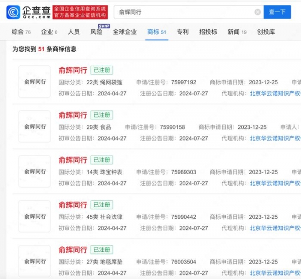 记者注意到,近日,与辉同行成功注册"俞辉同行"商标。企查查信息显示,与辉同行(北京)科技有限公司申请注册的多个"俞辉同行"商标新增注册公告,国际分类涉及食品、家具、运输工具等。该公司成立于2023年12月,法定代表人、执行董事、经理为董宇辉,监事为俞敏洪,现由北京新东方迅程网络科技有限公司全资持股。