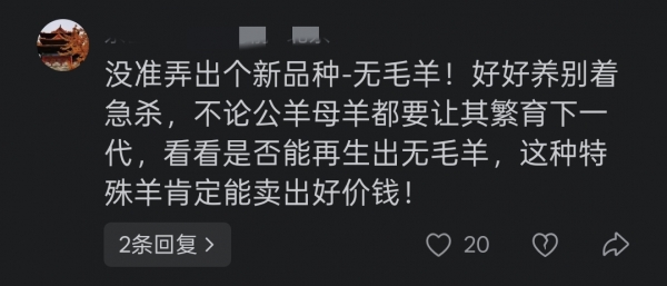 还有人觉得这是个稀罕事儿,建议崔女士别着急宰杀,不管这只无毛小羊是公羊还是母羊,都可以试着让它繁育下一代,说不定能培育出无毛羊新品种,将来肯定能卖出好价钱。