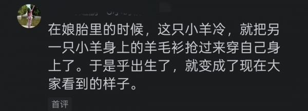 有人开玩笑说,肯定是这只小羊在娘胎里怕冷,把同胞兄弟的羊毛衫抢过来穿了,所以出生后才一个有毛一个无毛。